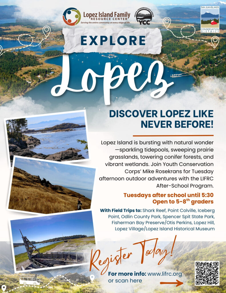 Lopez Island is bursting with natural wonder—sparkling tidepools, sweeping prairie grasslands, towering conifer forests, and vibrant wetlands. Join Youth Conservation Corps’ Mike Rosekrans for Tuesday afternoon outdoor adventures with the LIFRC After-School Program.